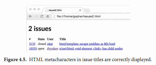 图4.5显示了该查询的结果。注意,html/template包已经自动将特殊字符转义,因此我们依然可以看到正确的字面值。如果我们使用text/template包的话,这2个issue将会产生错误,其中“&lt;”四个字符将会被当作小于字符“<”处理,同时“<link>”字符串将会被当作一个链接元素处理,它们都会导致HTML文档结构的改变,从而导致有未知的风险。