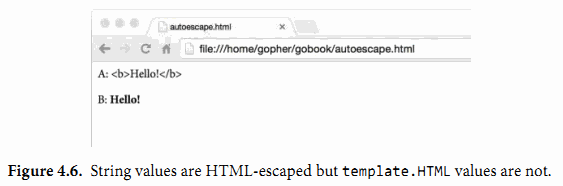 我们也可以通过对信任的HTML字符串使用template.HTML类型来抑制这种自动转义的行为。还有很多采用类型命名的字符串类型分别对应信任的JavaScript、CSS和URL。下面的程序演示了两个使用不同类型的相同字符串产生的不同结果:A是一个普通字符串,B是一个信任的template.HTML字符串类型。