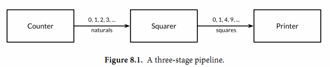 Channels也可以用于将多个goroutine连接在一起,一个Channel的输出作为下一个Channel的输入。这种串联的Channels就是所谓的管道(pipeline)。下面的程序用两个channels将三个goroutine串联起来,如图8.1所示。