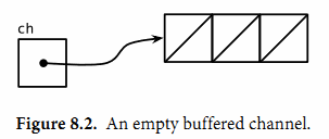 那么channel的缓存队列将不是满的也不是空的(图8.4),因此对该channel执行的发送或接收操作都不会发生阻塞。通过这种方式,channel的缓存队列解耦了接收和发送的goroutine。