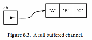 此刻,channel的内部缓存队列将是满的(图8.3),如果有第四个发送操作将发生阻塞。