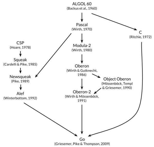 但是在Go语言的家族树中还有其它的祖先。其中一个有影响力的分支来自Niklaus Wirth所设计的Pascal语言。然后Modula-2语言激发了包的概念。然后Oberon语言摒弃了模块接口文件和模块实现文件之间的区别。第二代的Oberon-2语言直接影响了包的导入和声明的语法,还有Oberon语言的面向对象特性所提供的方法的声明语法等。